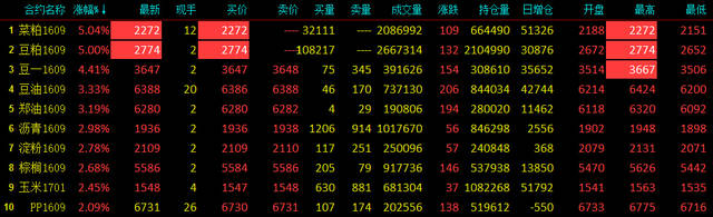 内盘农产品期货强势爆发,豆粕、菜粕盘中涨停,大豆触及涨停,豆油、菜油涨超3%。此前美国农业部在供需报告中,下调了2016年美国及全球大豆供应预期,称供应过剩将减少。