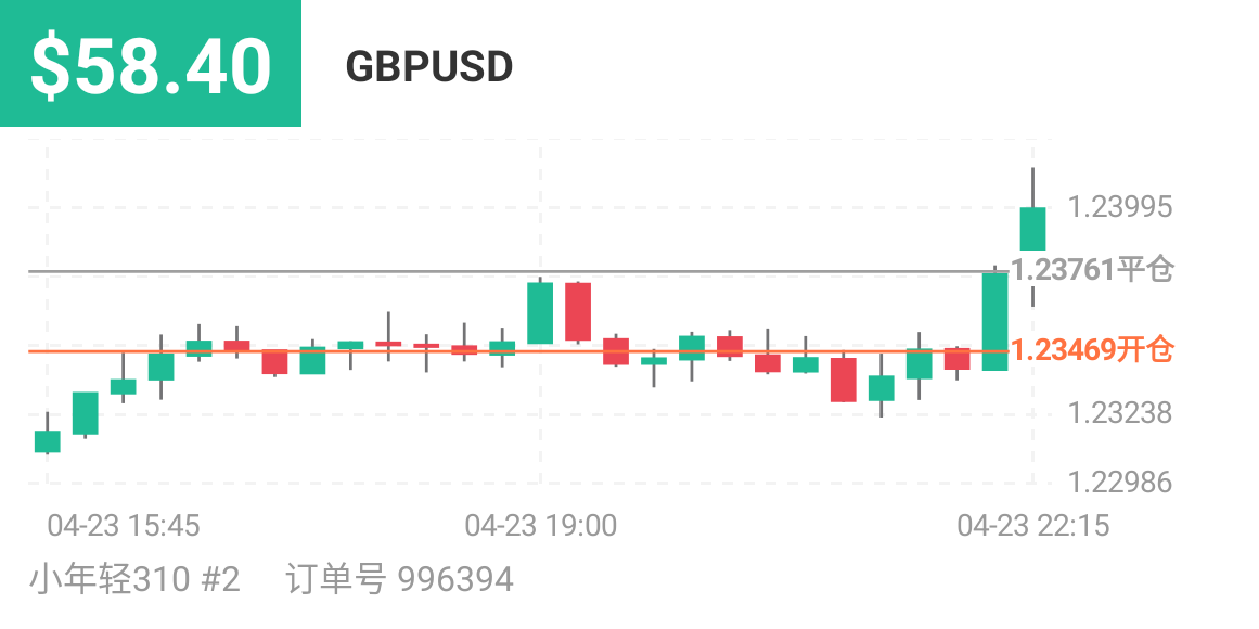 #GBP/USD# 早上进的多单,下午总浮盈到400没出,晚上浮亏100多,现在总盈利1.2375附近出来了,结果刚出来到了1.24,有赚就行,落袋为安
