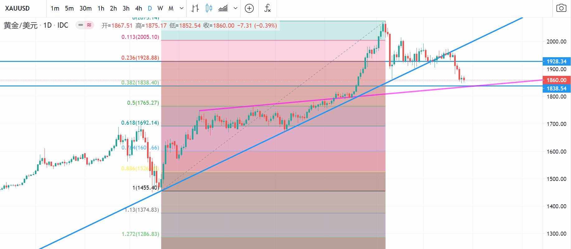 反之,若价格继续上破1937价格是斐波那契23.6%位置,金价上涨继续看1990附近,价格上涨很快上方看2050附近。