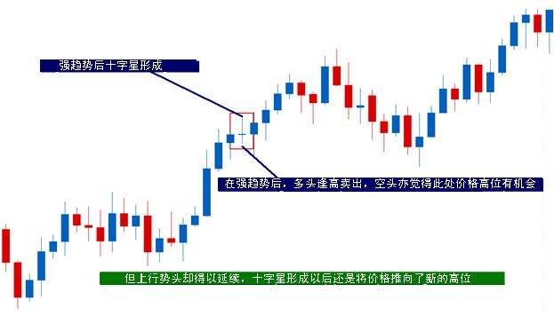 在出现十字星後将会发生什么,这比十字星本身重要。毕竟十字星只能告诉我们市场未决,不是么?如果汇价在趋势中走出了十字星,这有可能是一个很好的回调信号,如下图所显示。