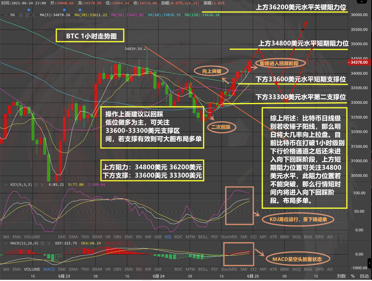 综上所述:目前比特币触顶回落之后,持续走震荡向下状态。结合各项技术指标来看,比特币短时间之内仍会向下回调,目前可关注33500-33700区间支撑,此区间支撑有效,那么行情将大几率开始震荡上行。