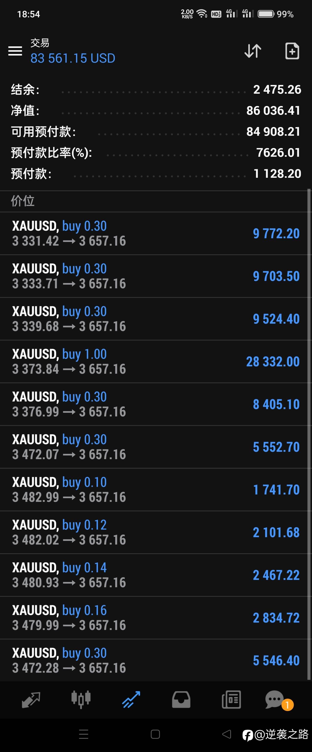 五月二十号左右爆完仓,入了10000金,然后就爆发了一波,六月初盈利11000已经把这个账户的亏损补平,后面一路高歌猛进,上周盈利11000刀,这周两天4400刀。目前账户48000刀,有38000刀都是用10000美金做出来的。想自己2010年入市,做到2013年亏完了自己工作的第一桶金18万左右,放弃了三年,16年到2019年又亏掉12万,疫情后再入场,直接亏掉62万,到2021年五月份总算有点长进了,交易断断续续,也算经历了11年了,目前账户48000刀,现在只想赚回自己的140000刀。路漫漫其修远兮,吾将上下而求索!祝福我吧,朋友们。