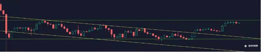 4. 日内小级别周期来看,BTC仍然是运行在一个黄色的下降通道中。且处于绿色矩形整理区域的下沿。任何一个形态的突破都有可能造成行情的加速。无论是向上或是向下的突破。