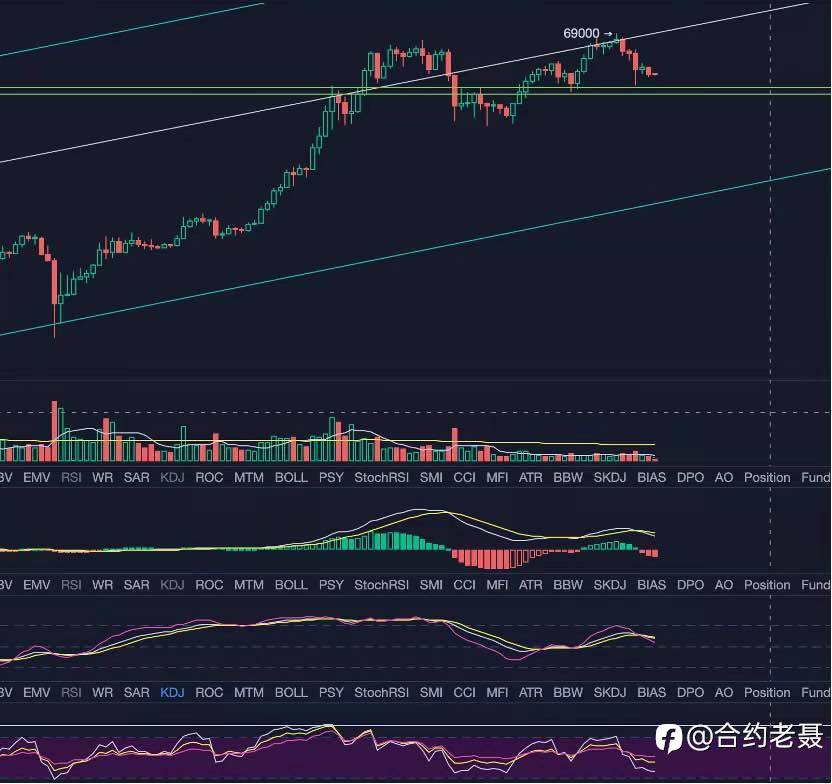 行情短期走势选择了继续回调,目前又来到了一个关键的位置——即46000左右的矩形区域下沿处。今天主要看这里的支撑,如果支撑住还是一个宽幅的震荡局面,支撑不住则会往更低点寻找支撑。