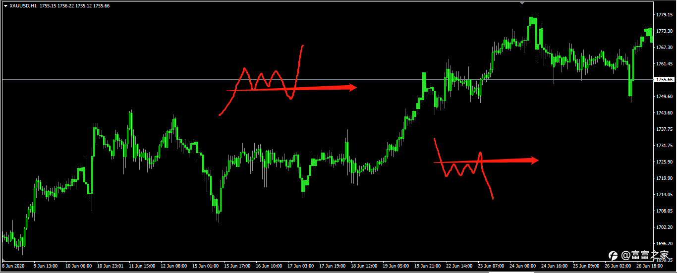 3、后续的价格突破第5根K线的高点,即可参考进多。