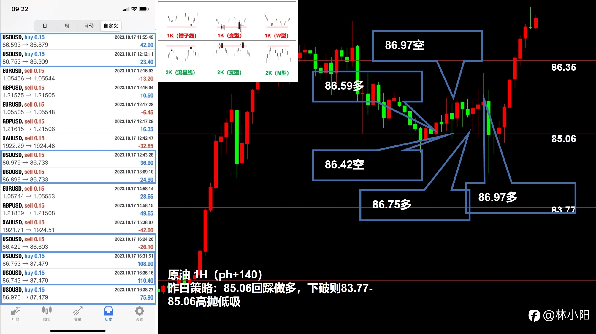 【实盘总结:以原油举例,昨日判断原油箱体76.44-77.68高抛低吸等待突破,等待箱体上轨77.68形成M头形态后入场高抛,以箱体上轨和中轨阻力位,反复使用下破做空、回踩做空,但晚盘失误错过最后一波箱体下破行情】