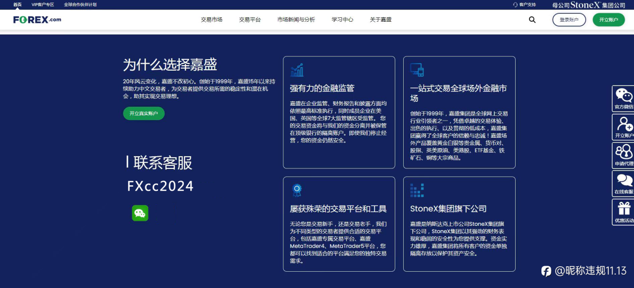 嘉盛受多国监管(如美国NFA、英国FCA、澳洲ASIC等),虽中国客户属于离岸监管,但其上市公司背景和长期合规运营增强了投资者信任。对比中小平台频繁跑路现象,嘉盛更显稳健。