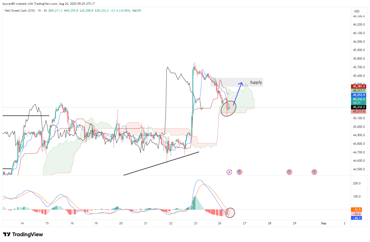 Sementara itu, indikator MACD menunjukkan histogram yang meruncut dan kedua garis mendekati potensi cross, menandakan momentum mulai melemah. Kondisi ini umumnya menjadi tanda awal akan munculnya pergerakan signifikan dalam waktu dekat, baik ke arah bullish maupun bearish, tergantung pada hasil breakout dari area Kumo.