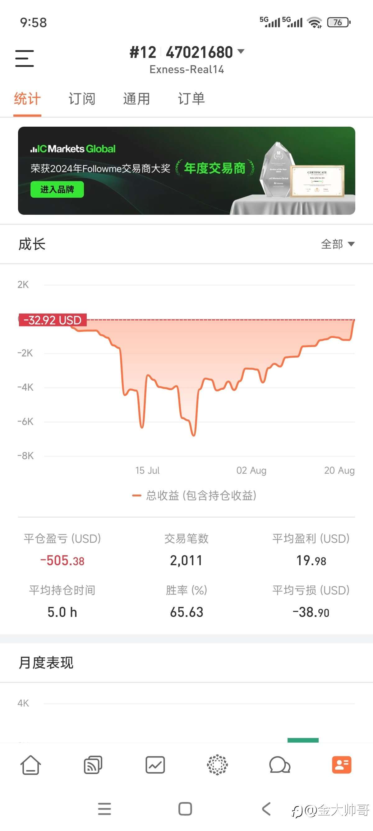 首先,我还是要明确我的观点,跟单只适合日内交易,如果是日线级别的交易,跟单者有一单没跟上,那可能是带单的盈利,跟单的亏损。这是有可能,因为他可能日线级别的盈利锁单对冲而且不带损,即使行情不符合预期,他就当止损,但是跟单的会一直亏损。