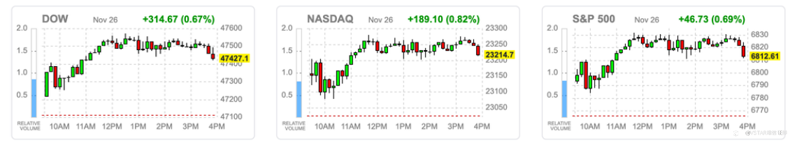 市场重新聚焦于12月潜在降息预期和AI生态系扩张,这两股力量叠加推动美股三大指数反弹,主要指数收盘回到50日均线附近,并重新站上关键短期趋势支撑。盘中因Alphabet推出新AI模型一度引发大型科技股(NVDA、MSFT、AMD、ORCL)波动下挫,但很快被市场解读为AI行业规模扩张和生态重估的一部分,而非纯利空,随后科技股回稳并带动指数重启涨势,收盘接近当日高点。