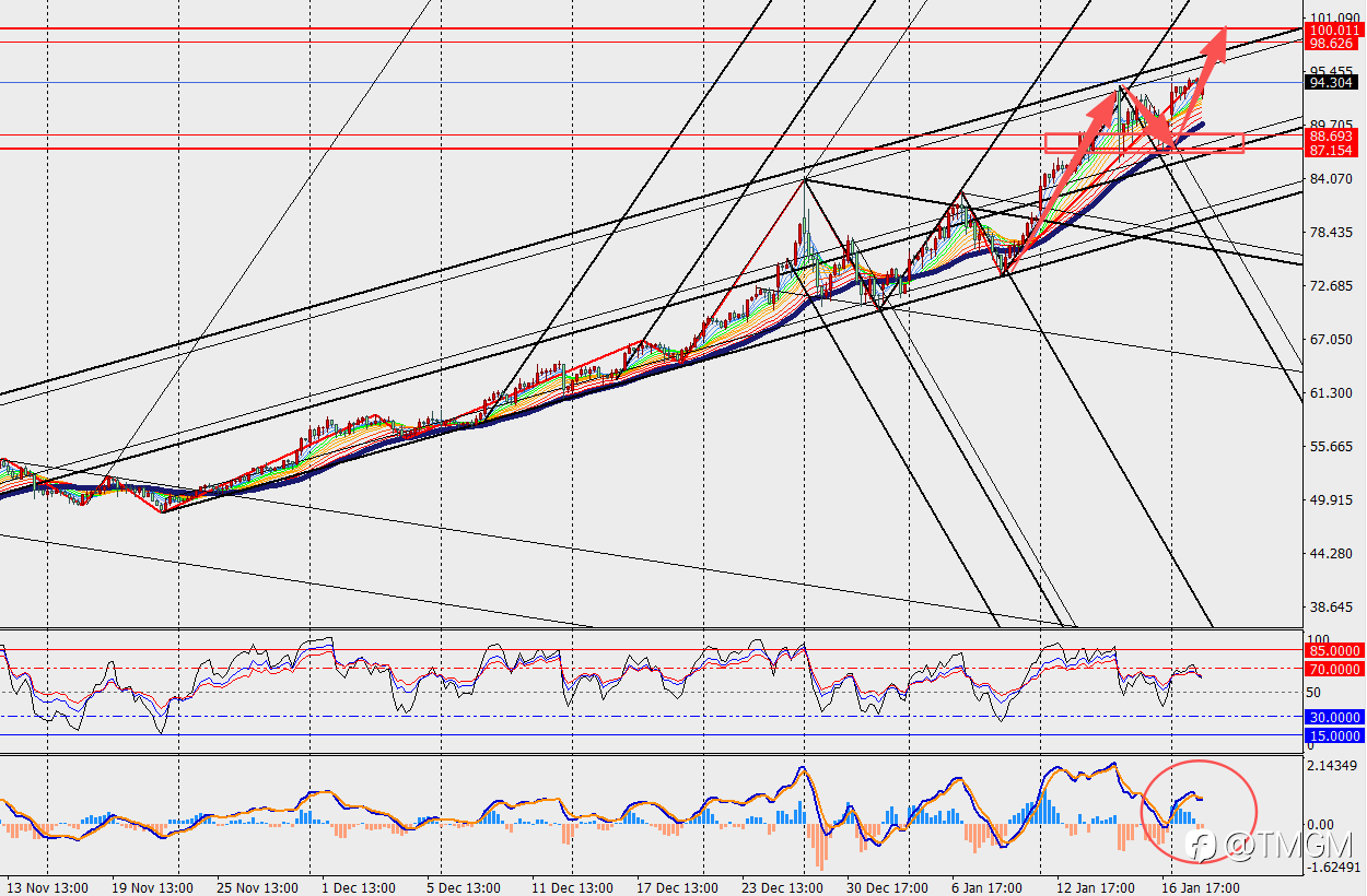 黄金H4级别震荡上行,MACD双线和量能柱在零轴上方收敛。世界黄金协会指出,若未来一年全球财政支出扩张、央行购金需求延续且利率中枢继续下移,金价有望再获15%至35%的上涨空间。若全球风险事件集中爆发,经济陷入深度衰退,金价则有望走出爆发式上涨走势。