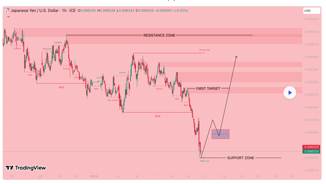 Break of Structure (BOS) gần nhất xảy ra khi giá vượt lên trên đỉnh thấp hơn trước đó quanh 1.3465, xác nhận xu hướng tăng tiếp diễn thay vì đảo chiều. Hiện tại vẫn chưa có Change of Character (CHoCH) được xác nhận, vì giá chưa phá xuống dưới đáy cao hơn gần nhất quanh 1.3440. Về mặt cấu trúc, điều này cho thấy nhịp chuyển động lớn vẫn nghiêng về tăng; các nhịp giảm hiện tại được xem là pullback/điều chỉnh, chưa phải đảo chiều xu hướng.