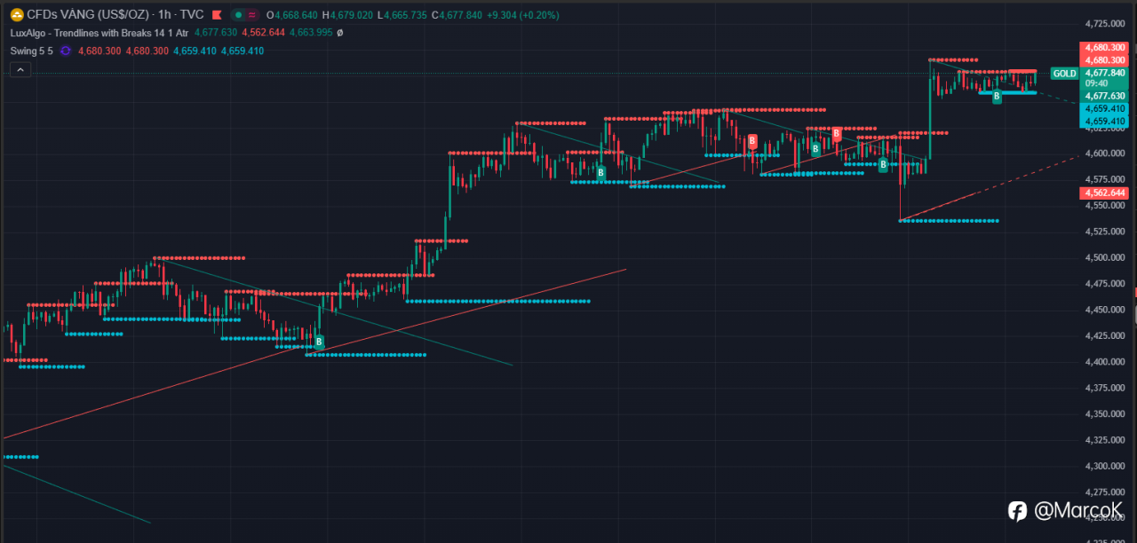 Các biểu đồ H1 cho thấy breakout impulsive mạnh, higher highs/lows rõ rệt, momentum bullish với consolidation ngắn trước extension.
