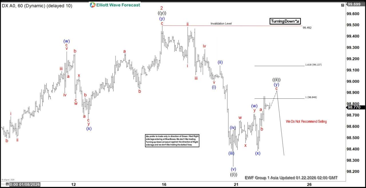 Here’s the 1-hour Elliott wave chart from the 1.22.2026 Asia update. In which, the decline to $98.24 low ended in wave ((i)) as an impulse structure. Up from there, the US dollar made a bounce higher in wave ((ii)) to correct that cycle. The internals of that pullback unfolded as Elliott wave double three structure & managed to reach the extreme equal legs area at $98.84- $99.13. From there, market makers agrees for the minimum reaction lower to take place.
