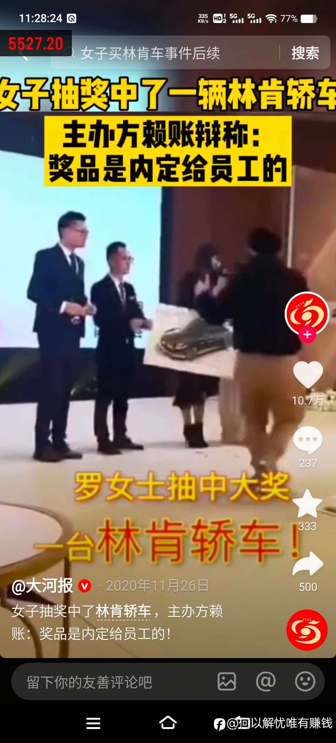 主办方赖账:活动结束后,主办方以“奖品内定给员工、抽奖出错”为由拒兑,仅愿提供林肯车模作为补偿。