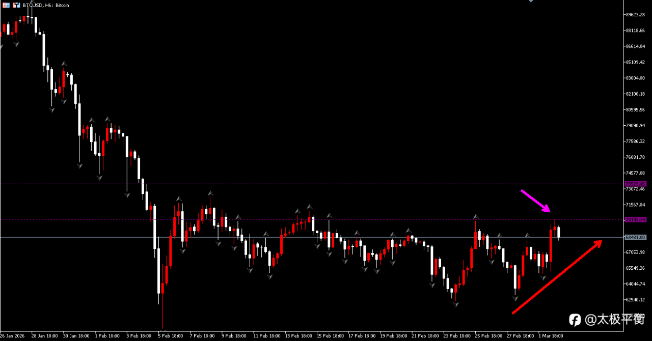 目前形成上涨动能结构,我们操作上在突破动能点70075(粉色箭头所示)上做多,目标看72000-72500;