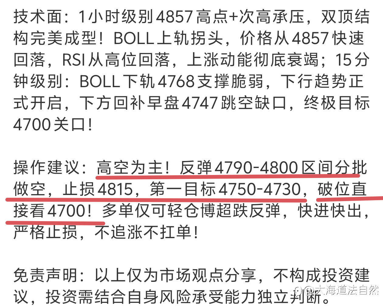 操作建议:主策略反弹做空,4765-4775分批建空,止损4780上方,目标4745-4730,破位持有看4700-4674,终极目标4644;多单仅在4730-4720轻仓试多,快进快出,止损4715,目标4760-4770。铁律重申:交易纪律第一,方向第二!严格带损,不追多、不抄底、不扛单,让利润奔跑!