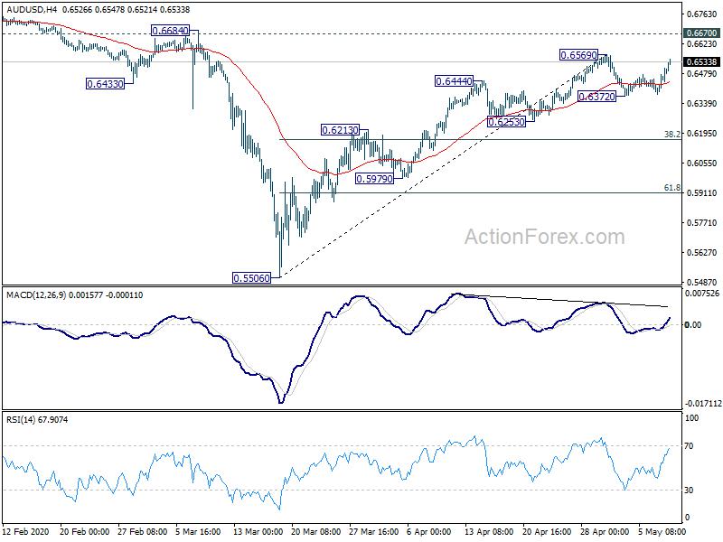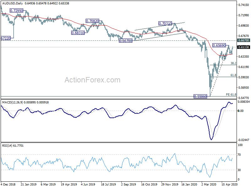 AUD/USD’s strong rebound argues that rise from 0.5506 is not over yet. Intraday bias stays neutral and focus is back on 0.6595. Break will turn bias to the upside for 0.6670 key resistance next. On the downside, though, break of 0.6372 support will revive the case of short term topping. Intraday bias will be turned back to the downside for 38.2% retracement of 0.5506 to 0.6569 at 0.6163.