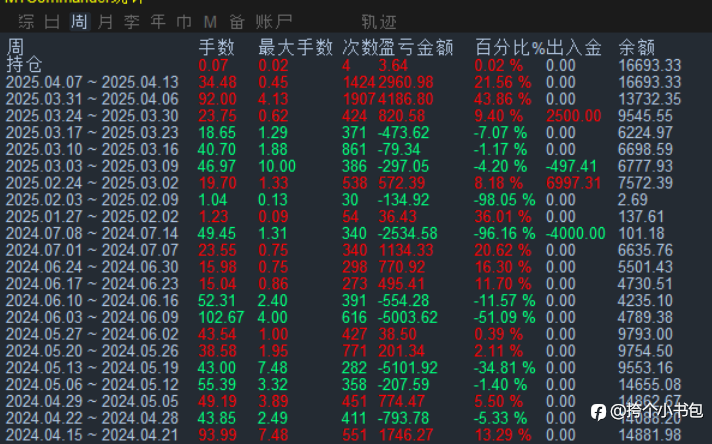 本周风控做的不错,最大浮亏为1425美金。