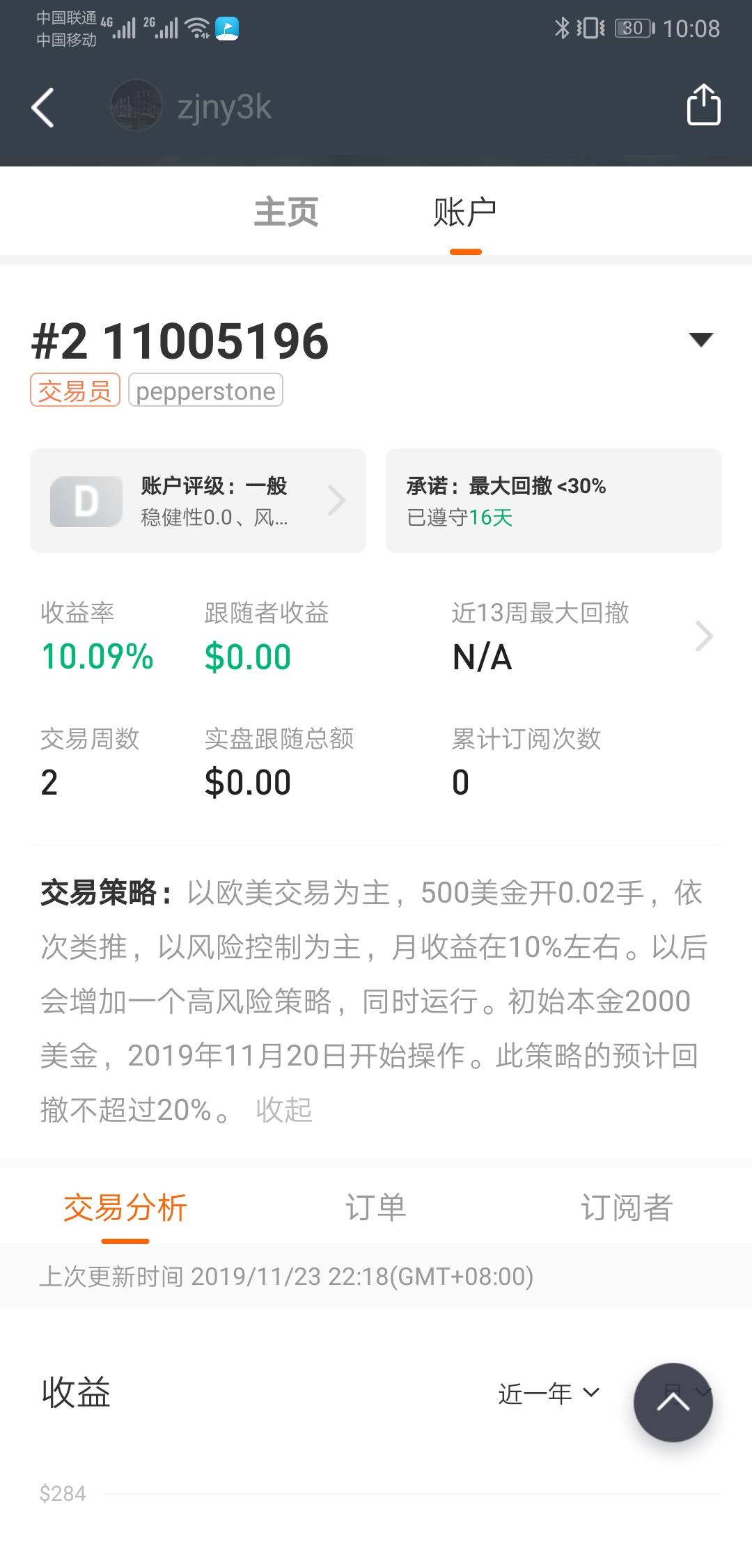 #EUR/USD# 这周收益不佳,买入单的隔夜费过高,影响了盈利。整体欧美波动不大,累计盈利2.9%,这周仅0.4%。此账户11月20日正式开始操作。考虑是否要再增加一个高风险的策略