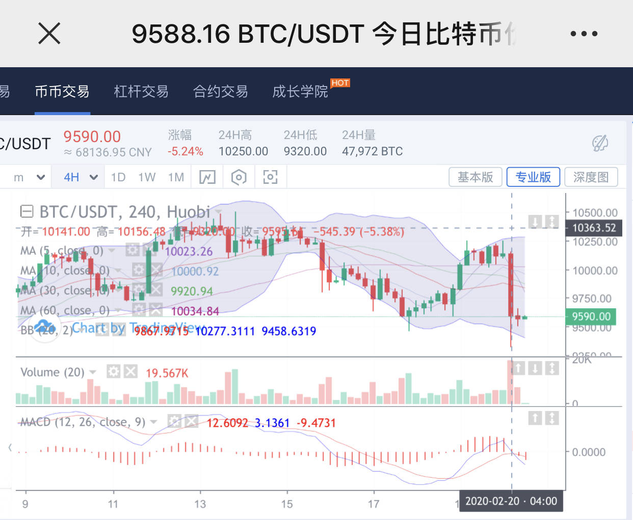 2.18日比特币行情走势:日线图中,行情已经接连五日处于下跌行情中,在昨日下跌期间有打破心理支撑点位9500到达最低点位9456,可见空方势力的强势和上方的抛压的沉重;而抛压点位的下移,致使币价的向下回撤,而多方量能迟迟不能恢复,一旦彻底跌破9500支撑点位,便再次打开了下行通道,并不断的向下寻找有力的支撑点位,那样一来9000关口危矣;附图中,各项指标均渐渐走平;若是能长时间的保持,则便会有所转机;四小时级别图中,布林带收口,行情虽然借助着触底9456的反弹重新回到了五日均线上方运行,可是并没有持续太长时间,最终还是从其上方滑落下来,现位于9703;五日均线平缓运行,其他均线均下行,对其施以压制;附图中,MACD快慢线在零轴下方运行,呈现死叉状态;RSI和Stoch均保持着向下放量的姿态运行着;由此可见短期行情仍有向支撑点位展开攻势的趋势。操作建议:9500附近进场多单,止盈点位于9650,止损点位于9450;9700附近进场空单,止盈点为于9550,止损点位于9750。#交易笔记重磅升级#