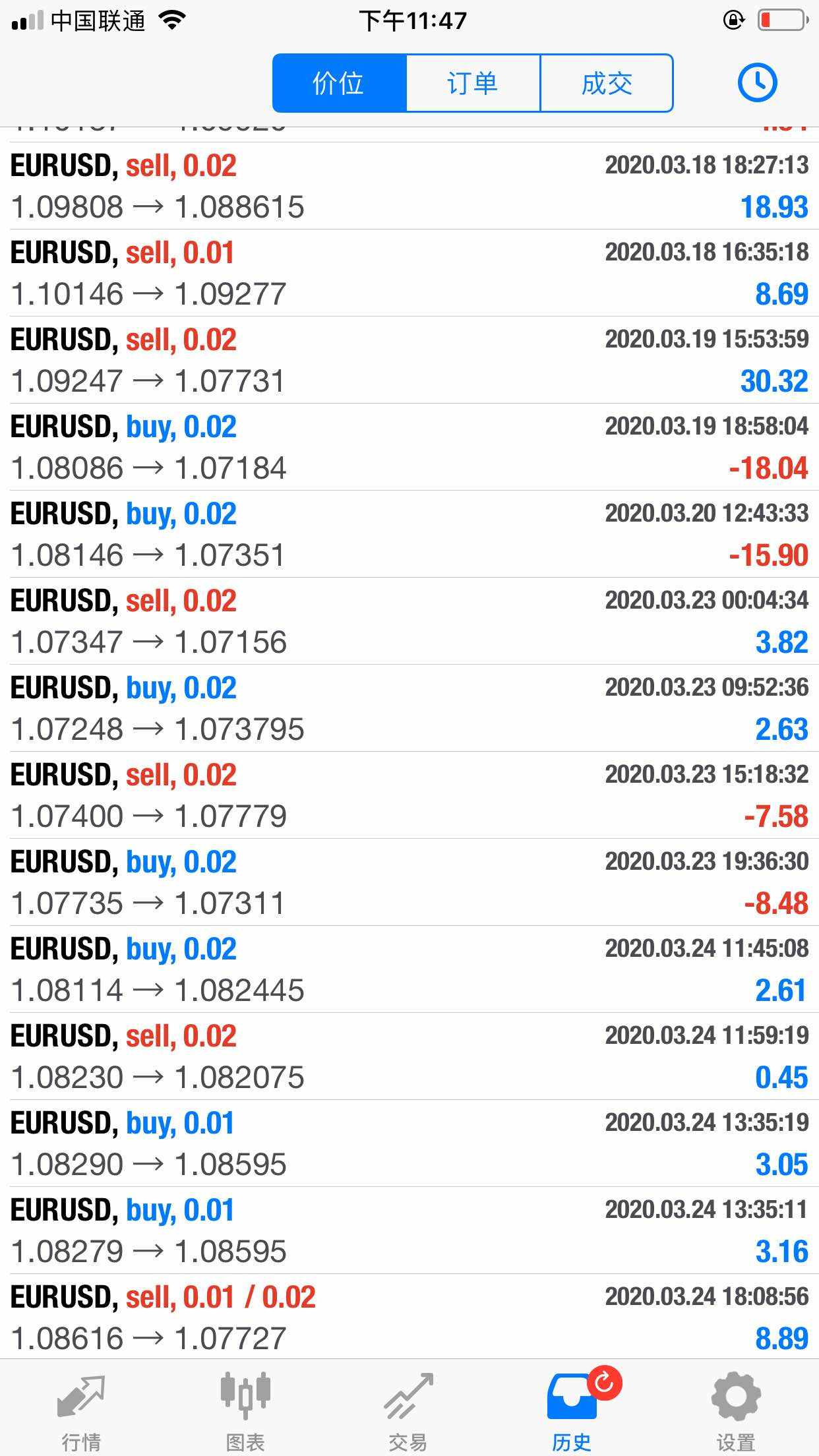 #EUR/USD# 晒一下成绩从3月17号使用新的交易策略到今天共18天,总共下了38单(盈利17/总共38=50%胜率)半个月0.02手盈利50.27美金,等我彻底掌握这个交易策略以后就可以下0.4手,那么每个月就可以盈利2000美金啦~~~ (◍•ᴗ•◍)