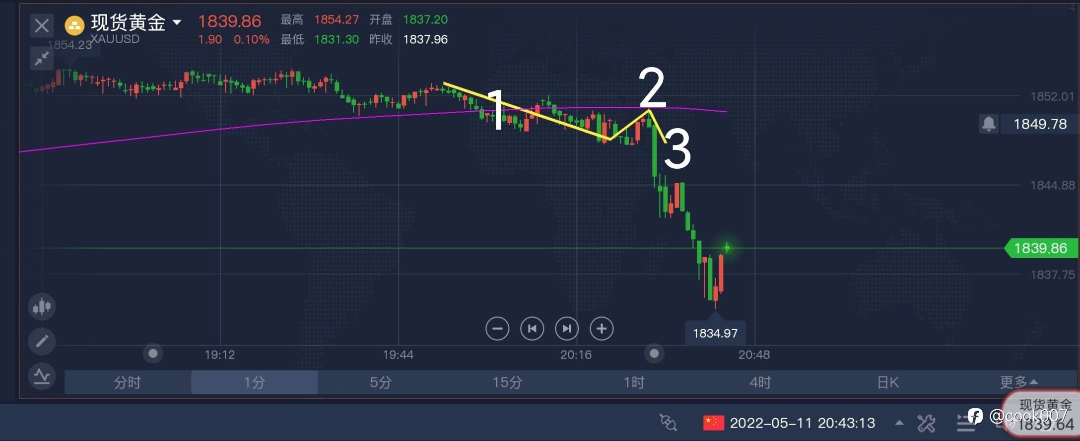 #XAU/USD# #交易笔记挑战赛第5期# 目前的走势,在1小时图,已经打到下行趋势线的1718位置,现在回落状态。下方1700为多防守位置。分钟图,上行趋势线走破,123法则出现1和2,暂时还没破1的低点,也就是1710,所以关注1710和1700附近,是今日需要关注的位置。