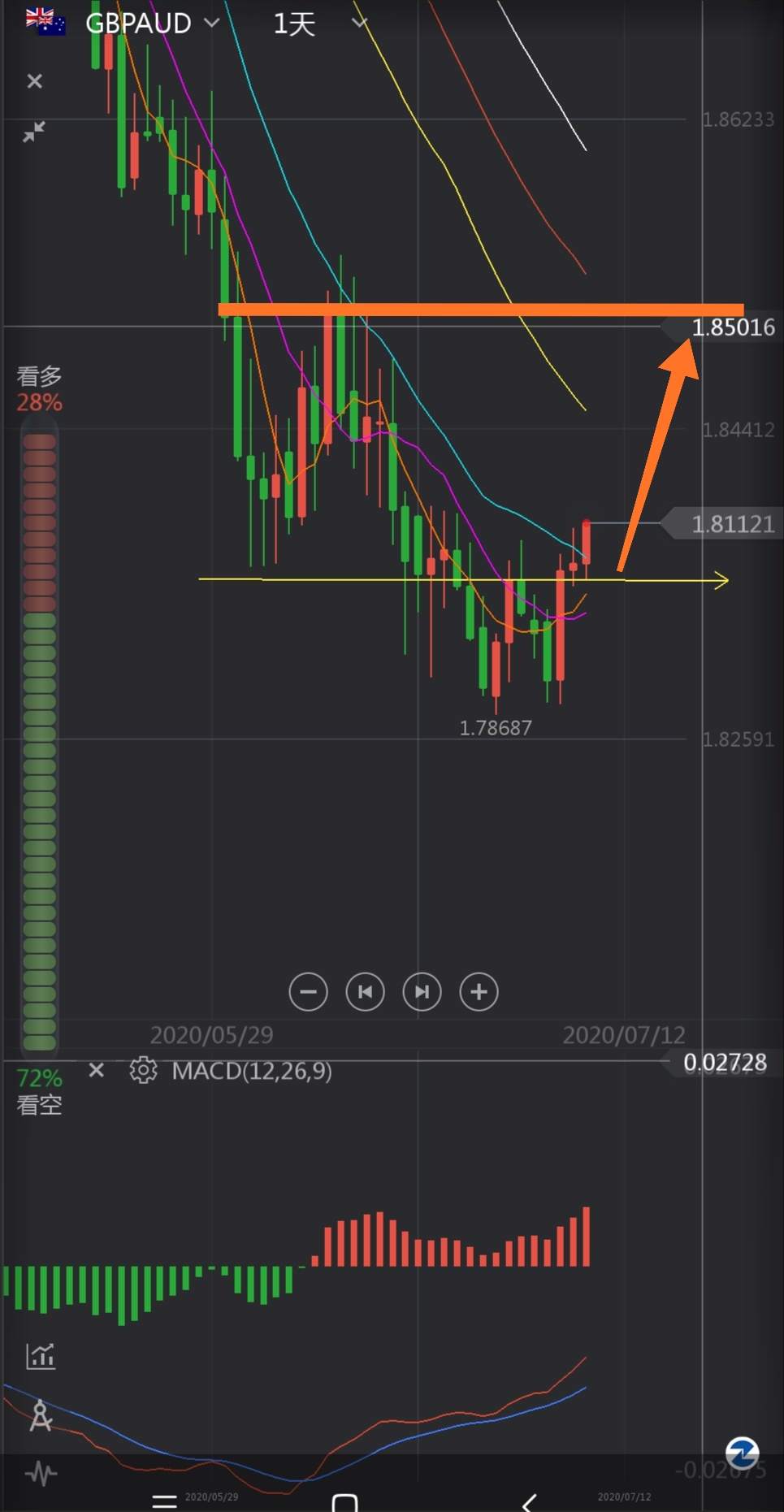 英镑澳元 日线W底 二次回踩颈线不破 看大反弹 1.810中线看涨至1.820-40