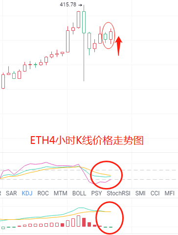 BTC自上周破高上下穿刺后,本周开始围绕11100区域进入盘整震荡整理阶段,个人认为一方面是换手资金得以再次注入,另一方面也是为了更好的在市场进行吸筹。4小时各主图指标延续走平,K线价格连续收取十字,这是短期行情转向的标志,附图死叉并未发散。