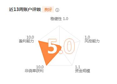 策略全面降低杠杆了 下个月的这个时候 官方的账户评级得分应该会提高不少 现在5分 非侥幸获利满分 盈利能力 满分 稳定性1分 风控 1分 资金规模 1.1分