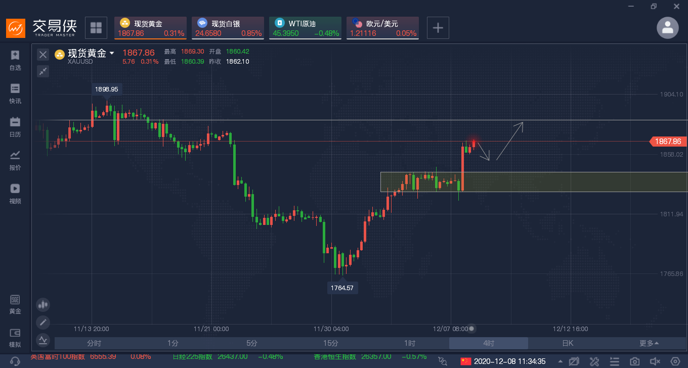12.18现货黄金昨日大涨30美元,最高点触及1896,日线收出三连阳形态,延续涨势,多空分水岭1865,我们今日还是以多头思路操作,今日早盘跌破昨日上涨的382位置1883,再看到下方618位置1875,若价格继续下破1875,则关注1865,昨日的起涨点。操作建议:1875做多,1870止损,1883止盈1865做多,1860止损,1874止盈1896做空,1900止损,1885止盈