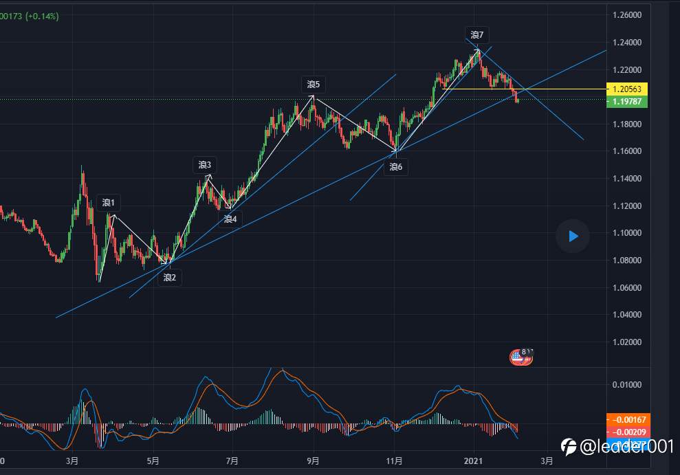 个人分析观点:欧元日线自2020年3月20的低点到2021年1月6日的高点走出了一波上涨7浪趋势,昨天欧元下破整个上涨趋势的上涨趋势线标志着这波上涨趋势的结束,技术面上将展开对这波趋势的回调,上方1.2060附近是重要的压力位,若价格回到此位置可以尝试做空。
