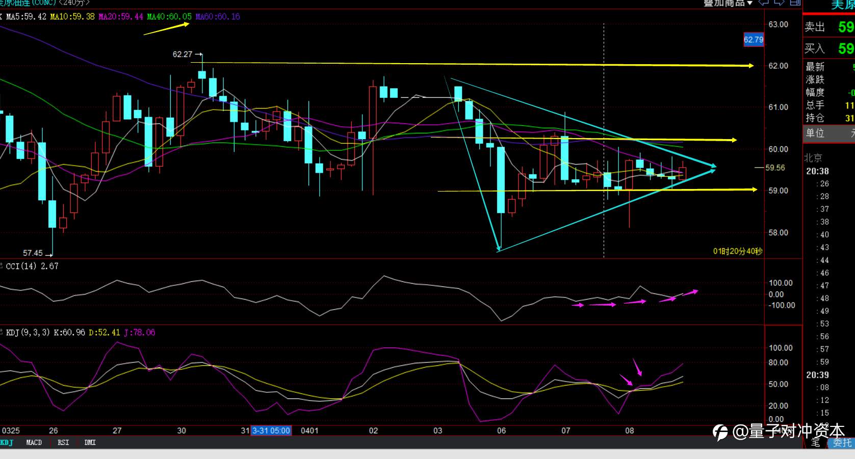 原油4小时正在三角周期末端运行,指标交叉向上发散运行,且实体大阳将价格运行在59支撑以上运行,我仍然维持59以上看多原油观点,能否打开上行通道的关键,就是60-60.15阻力,这是原油的多空分界线