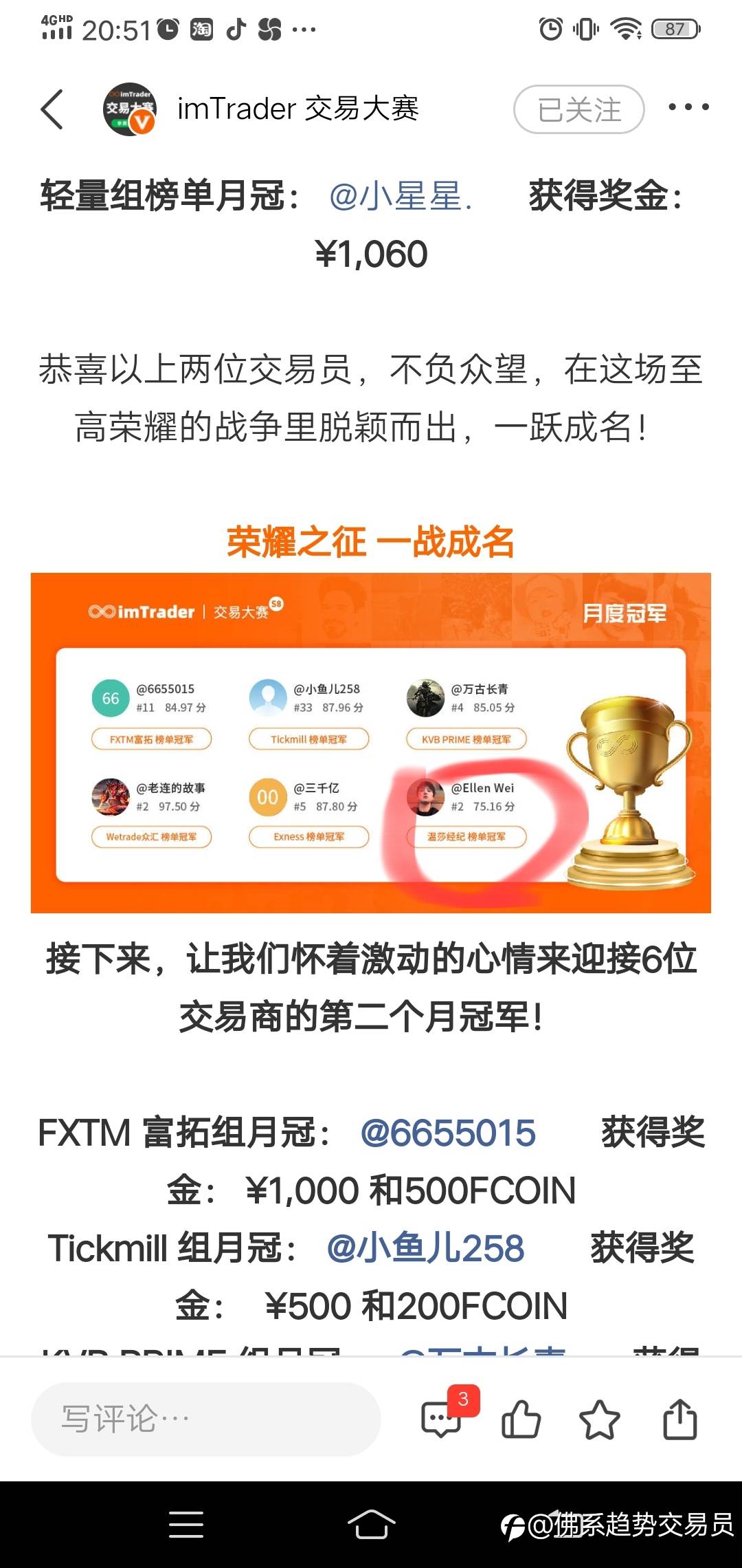 交易必须平常心,轻得失,重过程把控,盈利是自然而然的事。跟随我的人,要沉得住气,我的单量很少,需要设好倍数,或找我沟通探讨,谢谢信任。🤝🤝