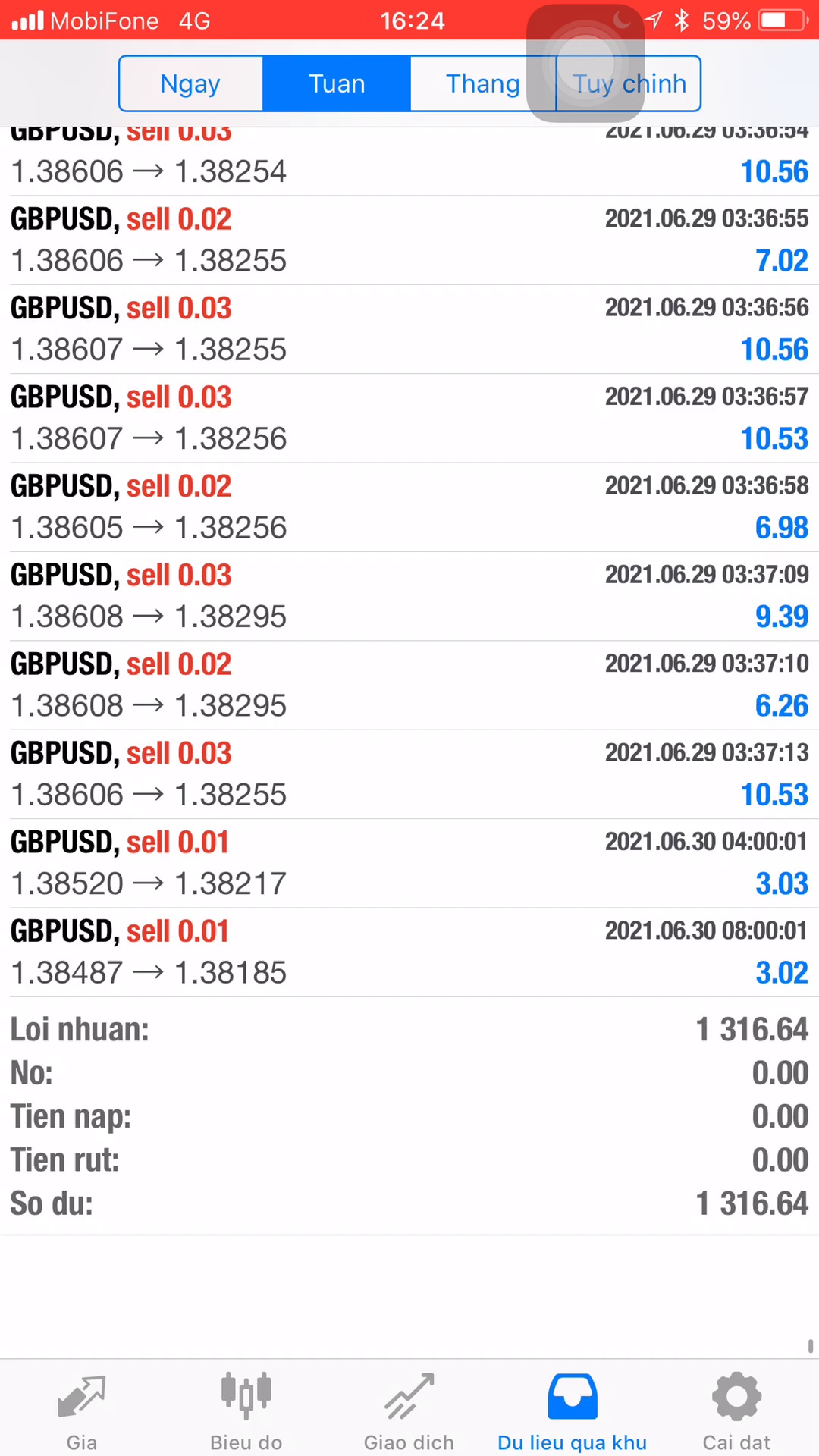 Sau 2 tháng, chạy tổng cộng 621 lệnh chia đều mỗi tháng là 310 lệnh, tỉ lệ win 76%, tổng 2 tháng gần 20 lot, mỗi tháng 10 lot x 32$ = 320$ tiền IB.