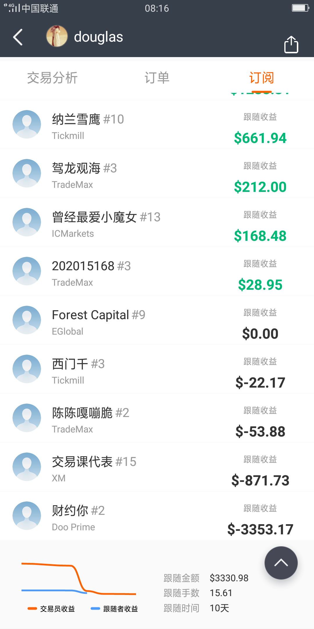 今天周六无事,就和新手汇报一下我的希望他人帮助带动致富经历。你好,我能跟随你做单吗?回答一,可以,我有喊单群,也可以一对一指导,每月三千元。回答二,可以,我给你个平台邀请码,你注册后可以免费给你喊单。回答三,可以,你把账户和密码发给我,我操作,盈利三七分成,结果亏损不见人影。回答四,可以,我有ea,非同一般,每月结算,二八分成,但亏损。回答五,可以,您想翻本吗?原油现在十八,现在炒底金字塔布局到零,稳赚。结果是原油出现负数。回答六,我的账号和密码是我的个人隐私,我不能给你,但我可以给你指导,因为我相信有缘人,你盈利了你给我百分之十的辛苦费即可。回答七,我只度有缘人,你的账户不管亏损或盈利,咱们俩均分。但亏损后不见踪影。回答八,我水平不行,但我的老师厉害,全网实时喊单,胜率有目共睹。可以免费试单。等等。经历多了,奉劝新人不要被这个平台的一些不挂靠账户但经常晒暴利单子的人所诱惑。就算他晒的是真的,也要观察他三个月后再跟随。一定要多多观察再做决定,挣钱急不得。