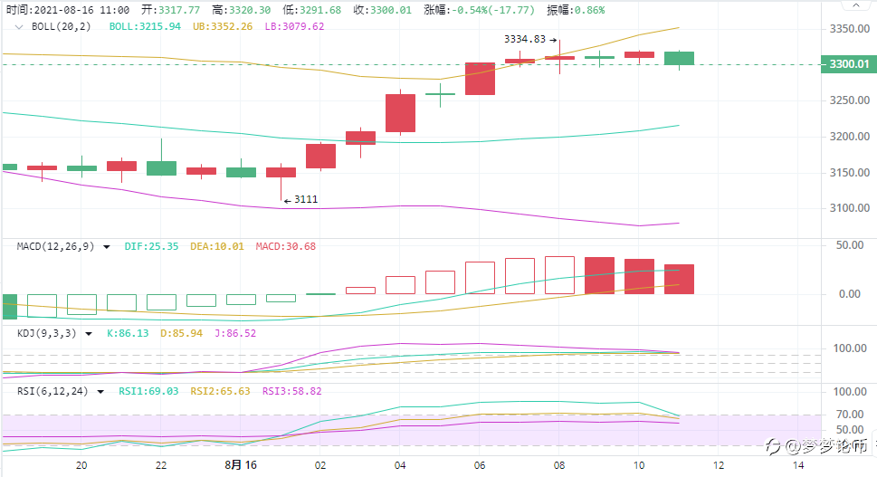 技术面小时图上早间下探过后,中午连阳拉起,突破中轨后但未能继续上行,上方承压较为严重,多头上行困难重重,无奈在此位陷入胶着,目前随着布林带开始有开口的迹象,行情短期来看会还是有上涨的希望,运行空间逐渐扩大,附图指标MACD双线在零轴下方不断向上运行,多头能量柱已经开始放量,虽说在放量,但币价没有丝毫的上涨,意味着行情将受压制逐步走低,晚间来看可以以低位做多的思路。