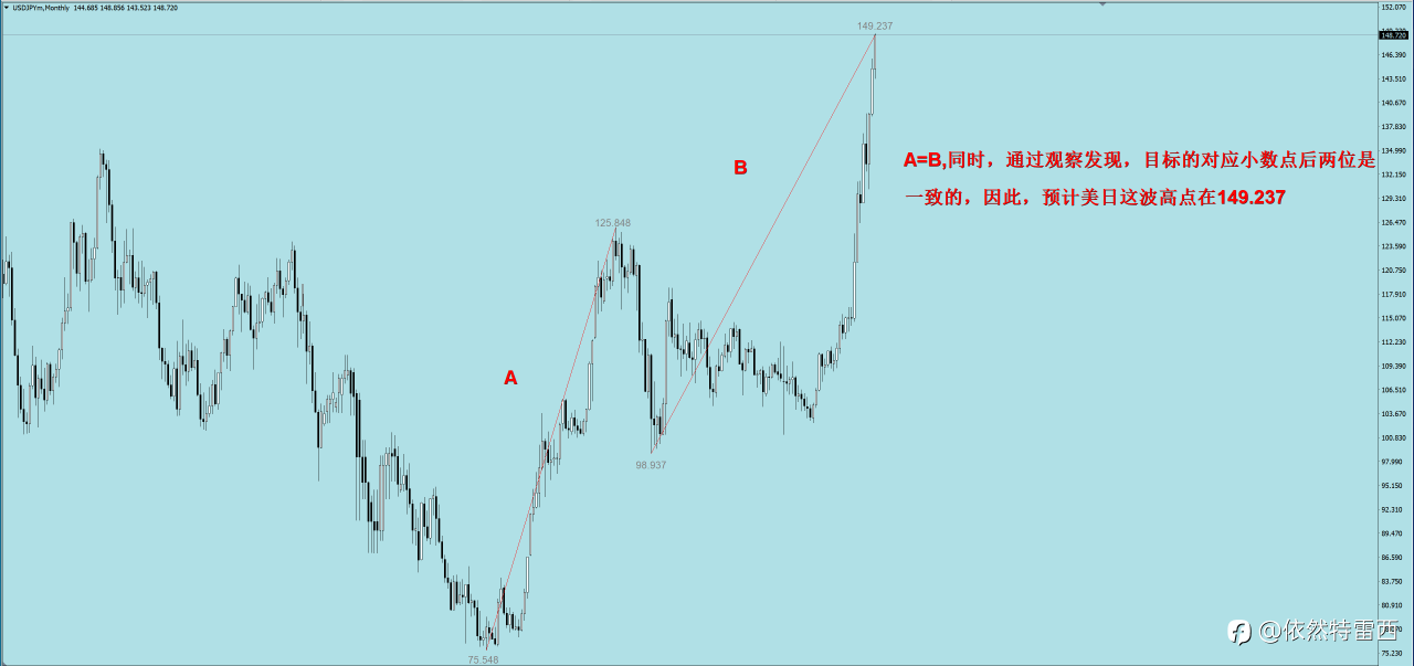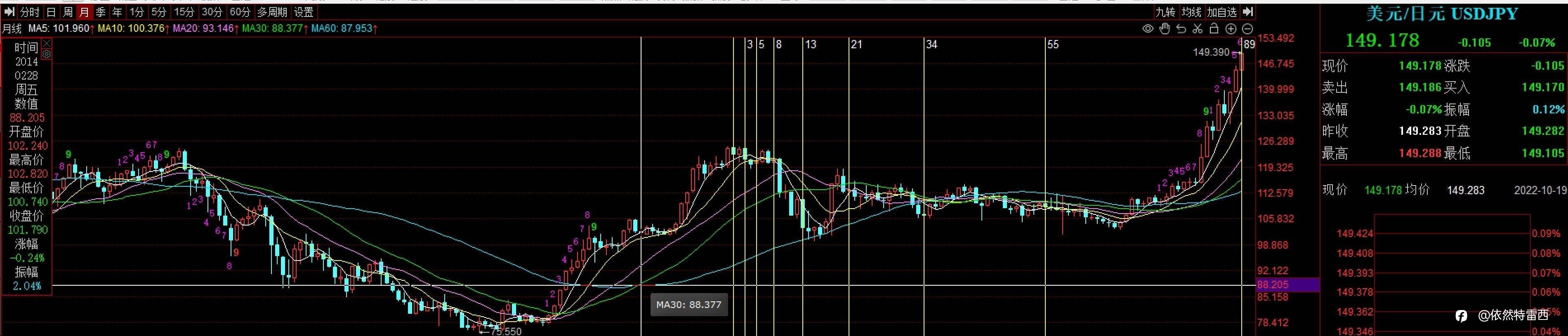 关于美日再补充一点:上周末提示的149.273已到,从时间周期看,斐波那契数字刚好是第89月,因此,点位和时间已形成共振,所以,看好这个月内变盘,目标先看133!