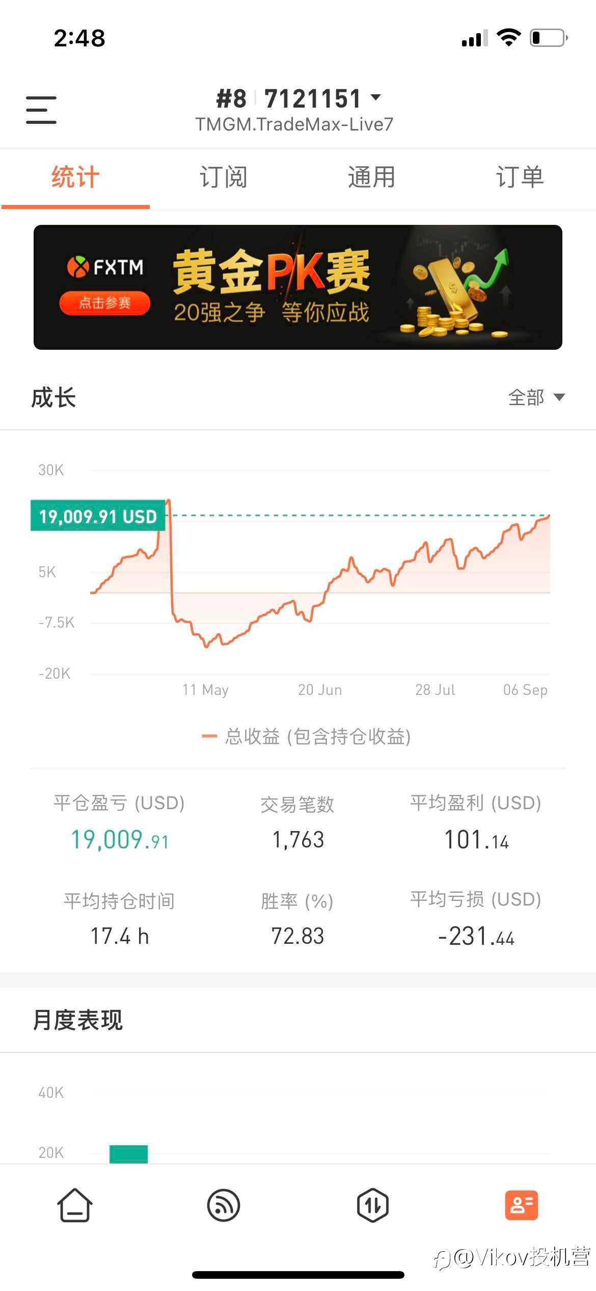 因为很久自己都是第一名觉得其实比赛也就那样,后来因为一些个人生活中的事情,有一段时间交易做的很差,最后当然参赛的账户也爆仓了所以呢自然就退出了比赛。