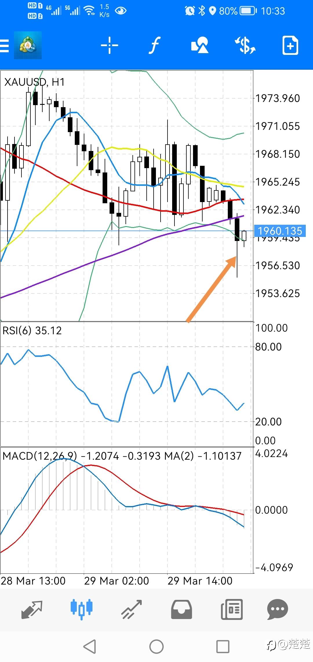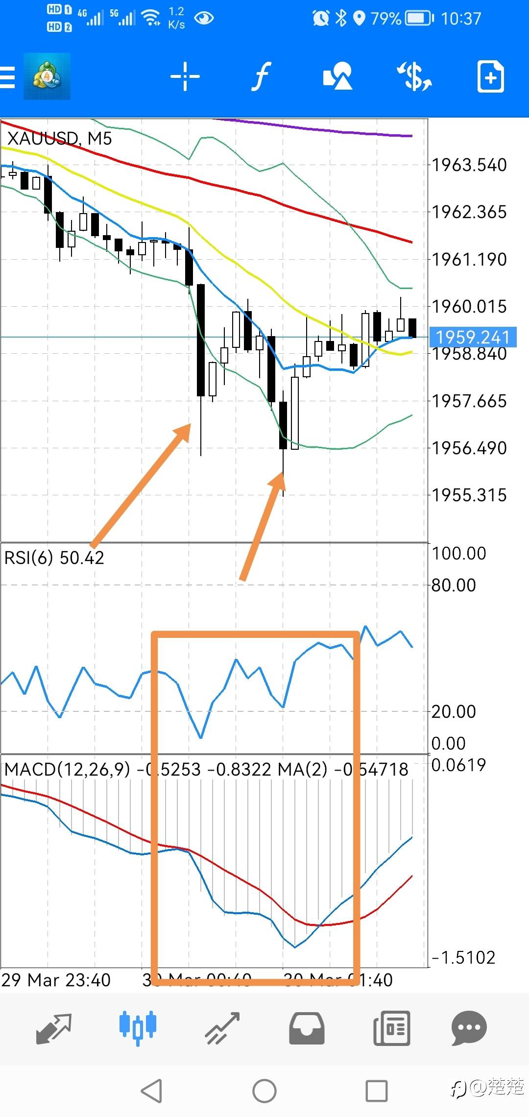 #刷单小技巧# 1、黄金小时线,急跌破下轨后反弹,一般会反弹到下轨附近,离下轨越远反弹力度越大。 2、5分钟上两次急跌,第二次RSI背离,MACD双线再次下跌,远离零轴有反弹形成金叉的要求,这时做多,反弹平仓时形成金叉。这个与大多数人对MACD理解不同,金叉不是买点,而且一个短线平仓位置,利用好MACD,可以买在金叉前。#Exness#