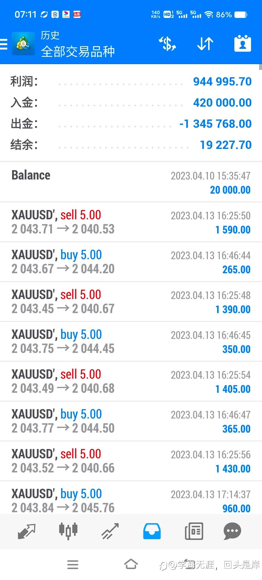 一直有点不知道是什么时候开始的了,查到历史记录了,1月12号ex10000美金开始跑的,现在不到4个月到75000左右了。可惜exness没有历史记录,后面德普同步的。看75000今年能不能到20-30万。实盘下周会考虑上五百美金的,慢慢复利吧,五百到过年预计3500-3000左右然后明年3000继续复利。一年可以做到20倍就可以了。今年10000的模拟测试的现在75000到过年20万应该问题不大