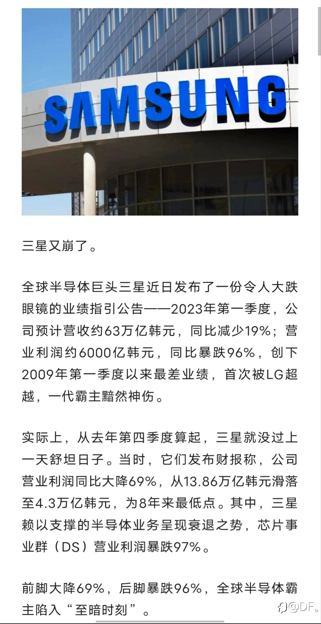 第二件事,三星的逆周期操作,开始自吞恶果,大量库存囤积,去年虽然全球销量第一,但是利润却暴跌,失去ZG这个世界最大的消费群体后,三星的日子并不好过,虽然此事不一定能击垮三星,也抢不走他的技术霸主地位,但是他还能维持多久呢,也是时候为自己的傲慢买单了