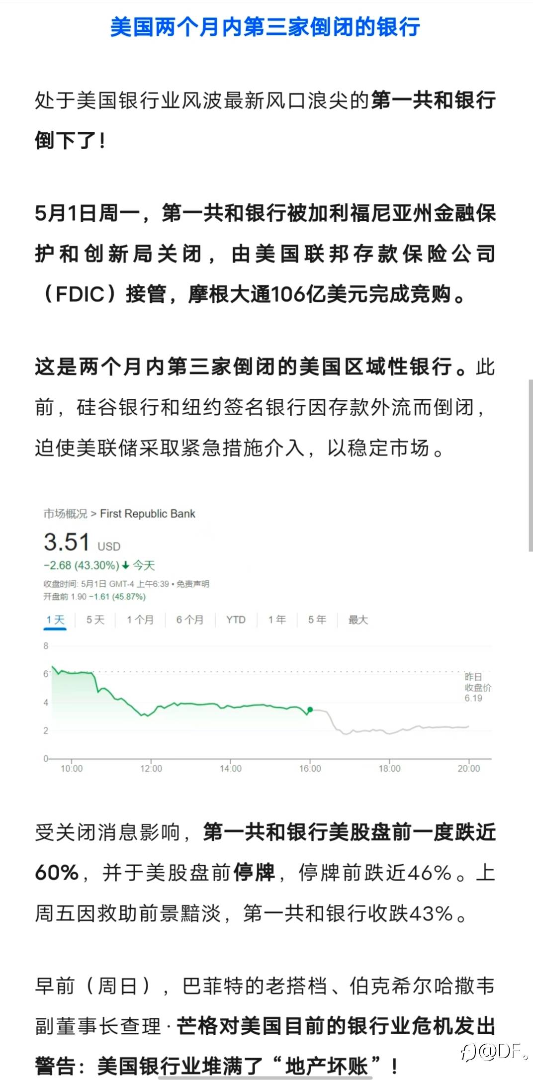 第一共和银行暴雷,标普已将其从B+下调致CC,信用观察为负面,虽然已经找到买家摩根大通,但是危机并没有缓和,此消息一出,不出意料成为大盘一大推手,两个月三家银行暴雷,这已经不是什么新鲜事了,以点及面,后续可能还会有一些小银行扛不住的
