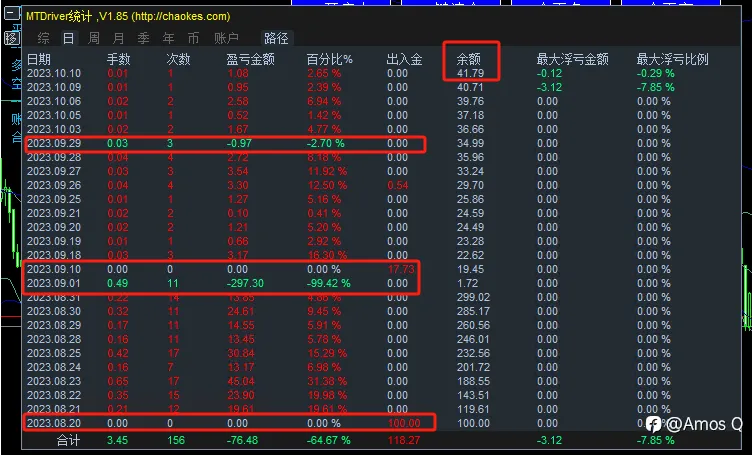 这个账户有点意思,他是在8月20在我这里入金100,十天玩儿爆,9月10号把账户返佣给出来我便接手,正好运气爆棚ea策略完美避开9月14单边行情,中间29号手动止损,每天就这么几毛的给他挣,希望月底能挣够100本金还给他。😓