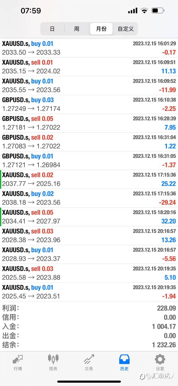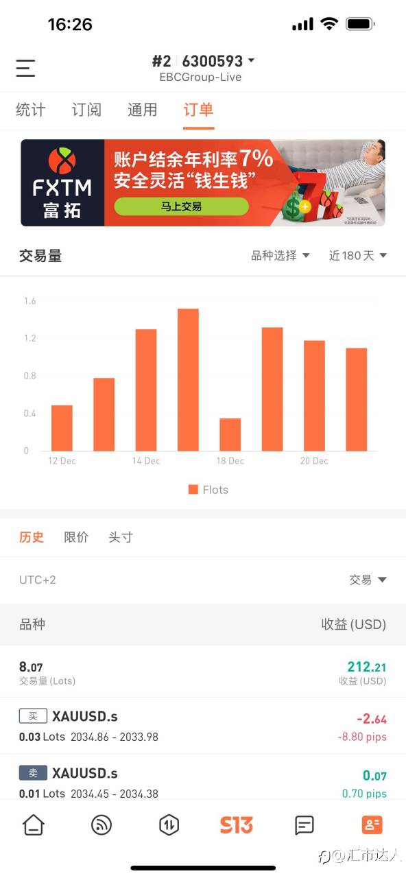 本周没有产生利润,但是自己下面的跟单账户有2%收益,这是因为此账户加了2个点的交易成本,每手都有20美金支出,保持此账户不亏,随着时间的延长和交易量的不断增加那么一个月下来跟随账户也有10%收益。此账户做单仓位不大,浮亏小。本周美日做反150点浮亏才几十美金,下周再接再厉。