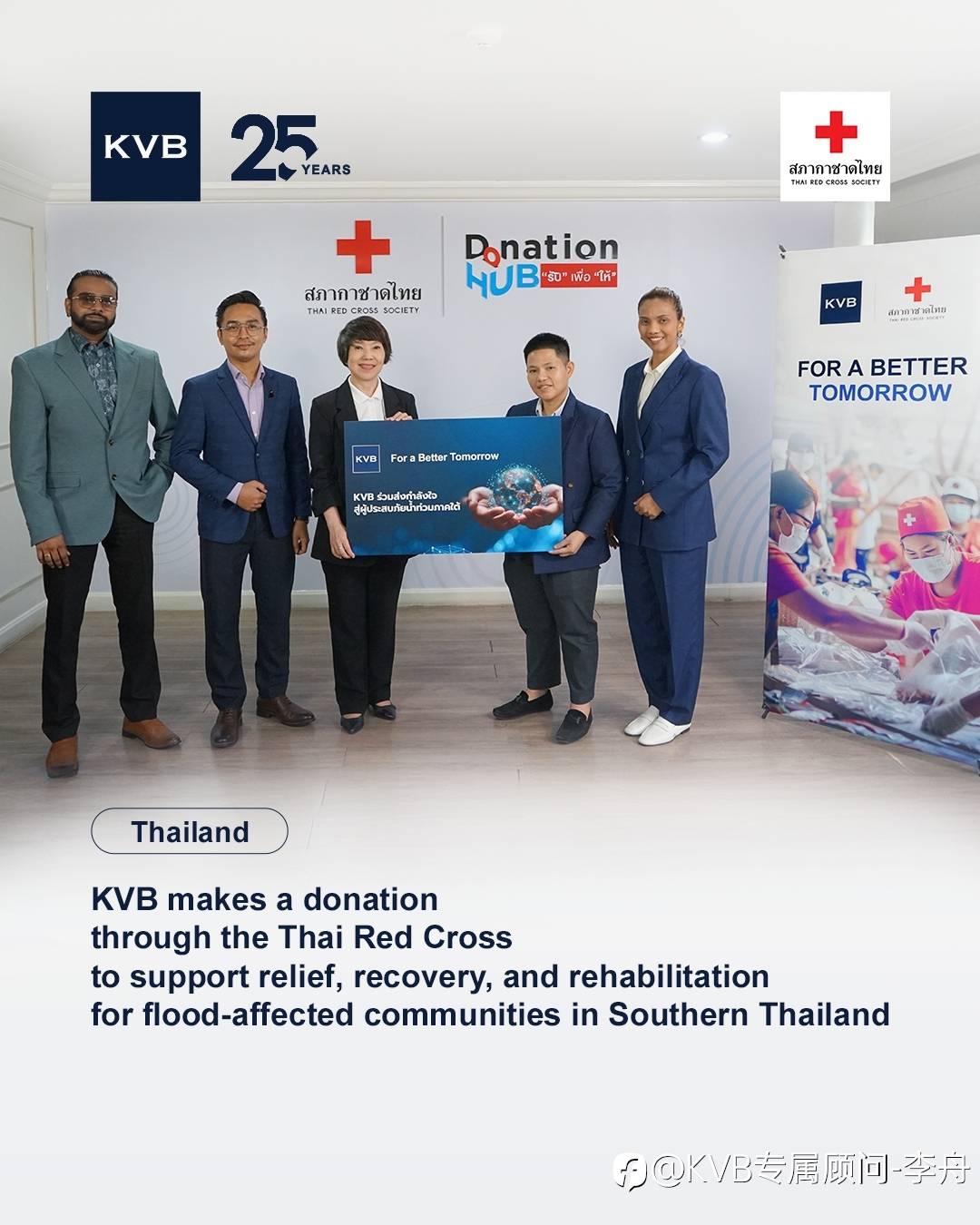 In response, KVB management and team members came together to support the Thai Red Cross Society through a CSR initiative, contributing financial assistance to aid relief and rehabilitation efforts in affected communities.
