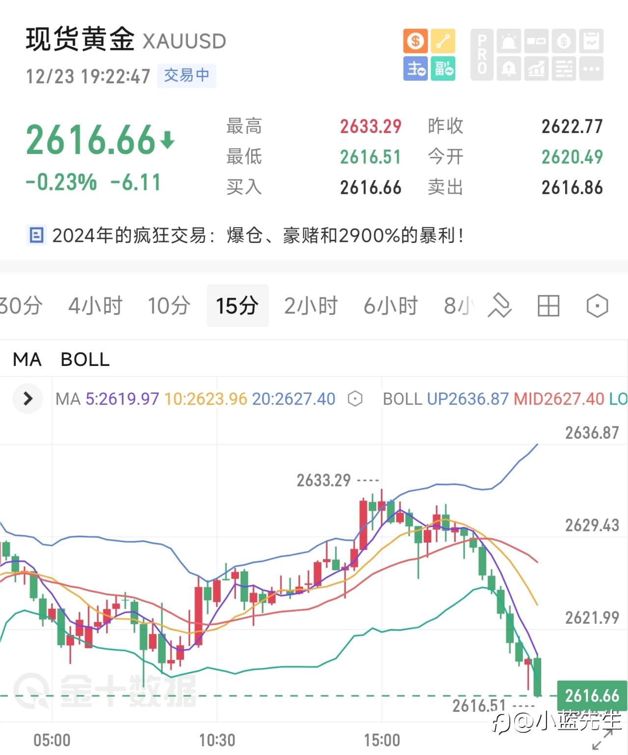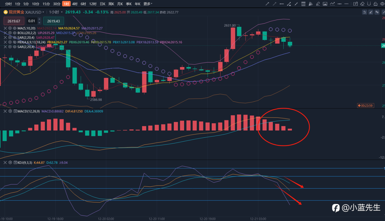 日k已来到布林带顶部,KDJ上涨已放缓接下来观察顶背离趋势的形成;4hKDJ三线同向向下且有进一步发展趋势并观察MACD的金叉形成。下方支撑关注4hBOLL中轨2670,上方压力关注2700。
