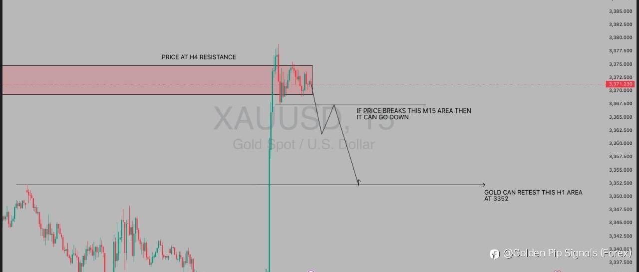 Price is currently sitting at a strong H4 resistance zone. If the market breaks below the marked M15 area, a bearish move is expected with potential downside towards the 3352 H1 support zone for a retest.