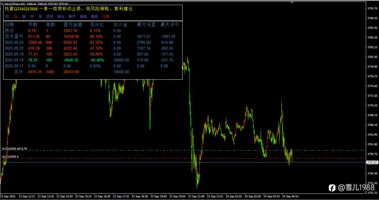 在“单一结带移动止损+复利建仓”的低风险策略下,账户近期盈利表现亮眼:单日最高盈利百分比达66.10%,累计盈利更是突破28033.69,这一数据直观反映出当前黄金多头趋势的强劲动力——趋势的持续性和爆发力,让顺势交易的策略获得了丰厚回报。