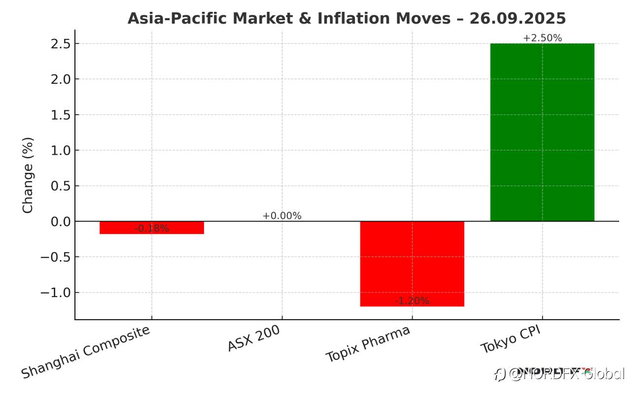 📉 Asia-Pacific markets slipped after President Trump unveiled new tariffs (100% on branded drugs, 25% on heavy trucks) set to take effect on 1 October. Pharma stocks led losses, with Japan’s Topix healthcare index down over 1%. Shanghai Composite −0.18%, while Australia traded flat.